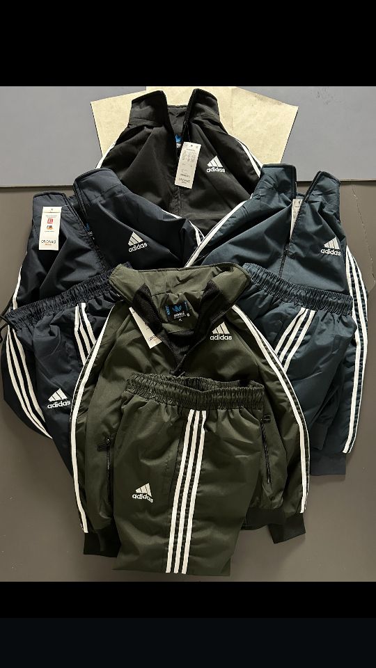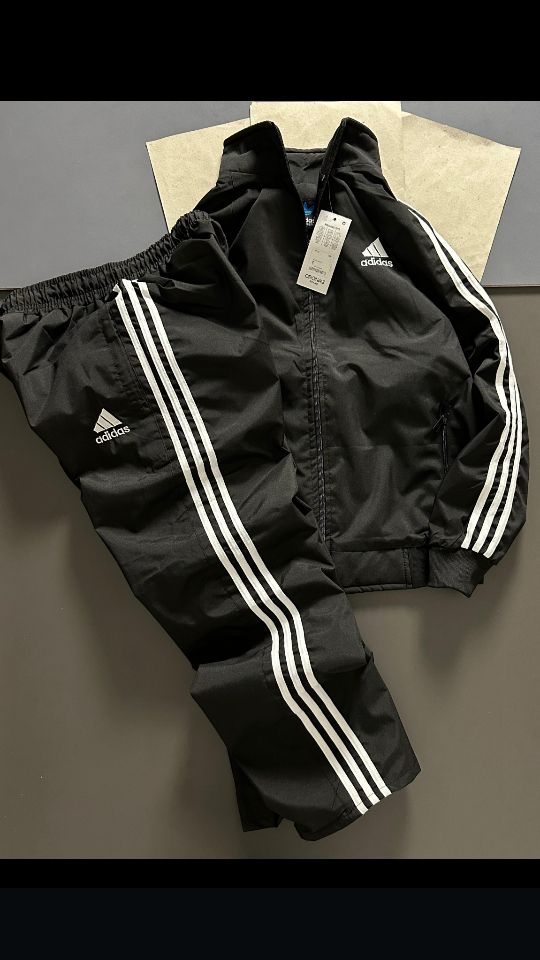 a classic black Adidas tracksuit, featuring both a jacket and matching pants with a sporty, iconic look�.Product FeaturesThe tracksuit consists of a zip-up jacket and pants, both in black fabric, accented with Adidas' signature three white stripes running down the sleeves and sides�.Each piece is branded with the Adidas logo on the front chest (jacket) and upper thigh (pants), adding to the authentic, athletic style�.The jacket has ribbed cuffs and a stand-up collar, while the pants are equipped with an elastic waistband for comfort and fit�.Suitable for casual wear, athletic activities, or street style looks, providing versatility and comfort�.